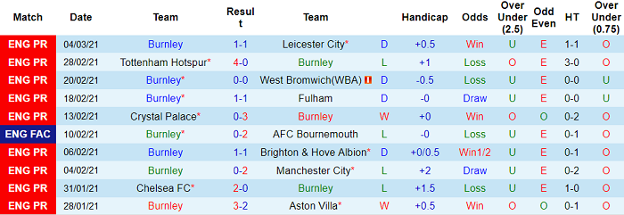 - Thống kê 10 trận gần nhất của Burnley