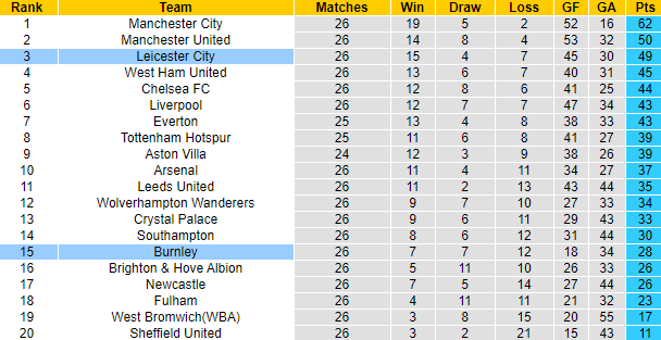 Trận đối đầu giai đoạn lượt đi giải Ngoại hạng Anh mùa này, Leicester đã giành chiến thắng thuyết phục với tỷ số 4-2 trước Burnley. Trên bảng xếp hạng Premier League, Leicester đang xếp ở vị trí thứ 3 với 49 điểm, Burnley xếp thứ 15 với 28 điểm sau 26 vòng đấu. Mọi thứ đều cho thấy sự vượt trội của Leicester so với đối thủ.
