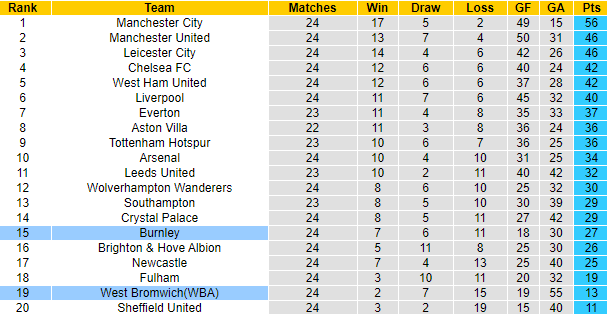 Sau 24 vòng đấu tại giải Ngoại hạng Anh mùa này, Burnley giành 27 điểm, xếp thứ 15 trên bảng xếp hạng. Trong khi đó với số trận tương tự, West Brom mới giành được 13 điểm, xếp ở vị trí thứ 19. Thành tích tốt hơn cùng với việc được thi đấu trên sân nhà, Burnley hoàn toàn xứng đáng được xếp chiếu trên trước giờ bóng lăn.