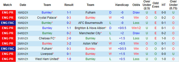 + Thống kê 10 trận gần nhất của Burnley