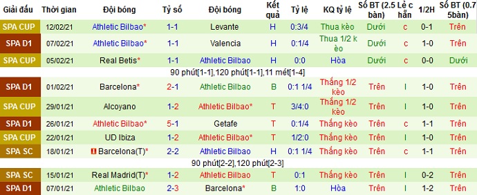 + Thống kê 10 trận gần nhất của Athletic Bilbao