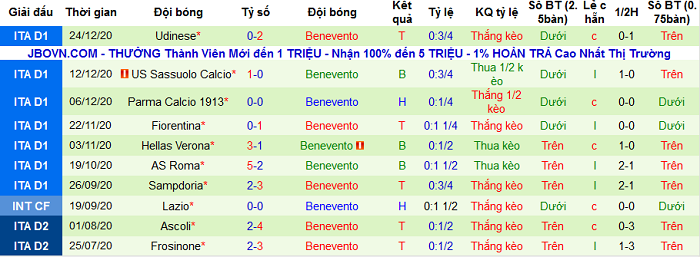 - Thống kê 10 trận gần nhất của Benevento