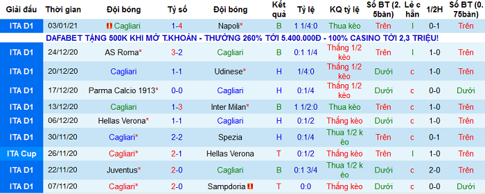 - Thống kê 10 trận gần nhất của Cagliari