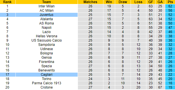 Mùa giải trước khi tiếp đón Juventus trên sân nhà trong khuôn khổ Serie A, Cagliari đã giành chiến thắng thuyết phục với tỷ số 2-0. Trận đấu sắp tới Cagliari đang rất tự tin với phong độ vào phom. 3 trận gần đây họ đạt thành tích bất bại với 2 chiến thắng và 1 trận hòa.