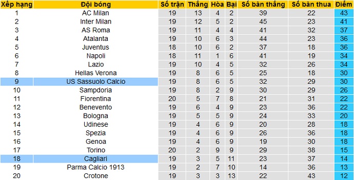 Trong khi đó Sassuolo đang đứng thứ 9 trên bảng xếp hạng với 30 điểm cũng sau 19 vòng đấu. Hiện Sassuolo đang còn cách các đội trong Top 6, có suất dự cúp châu Âu chỉ là 4 điểm.