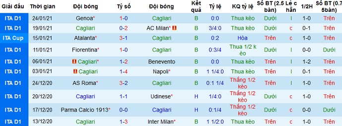 + Thống kê 10 trận gần nhất của Cagliari