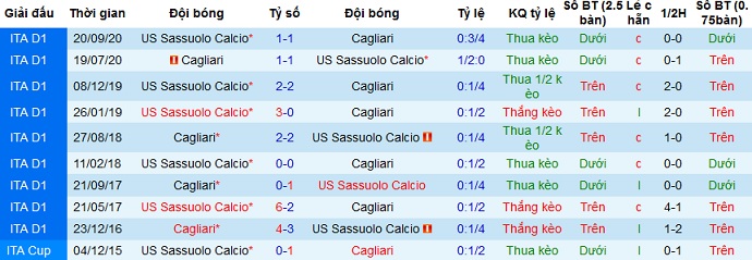 + Lịch sử đối đầu Cagliari vs Sassuolo