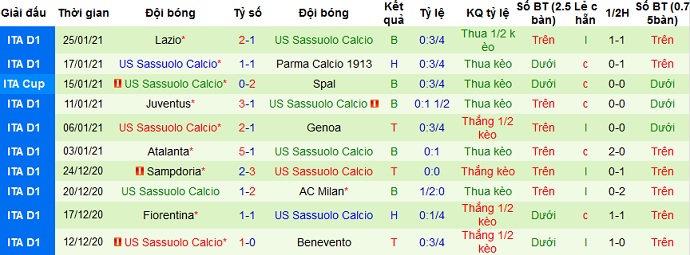 + Thống kê 10 trận gần nhất của Sassuolo