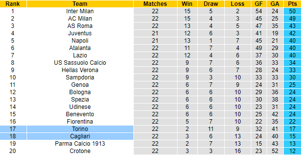 Cagliari và Torino đều đang được coi là ứng viên... xuống hạng tại Serie A 2020/21. Sau 22 vòng đấu, Cagliari giành 15 điểm, xếp thứ 18 trên bảng xếp hạng. Torino khá hơn một chút khi giành 17 điểm, xếp ở vị trí thứ 17. Dĩ nhiên, lợi thế ở trận đối đầu sắp tới thuộc về Cagliari khi họ được đá trên sân nhà.