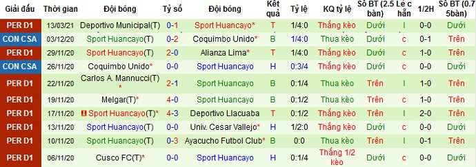 + Thống kê 10 trận gần nhất của Sport Huancayo