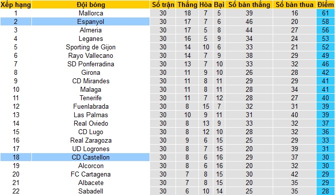 Trong khi đó Espanyol vẫn đang đứng thứ nhì trên bảng xếp hạng. Với 58 điểm có được sau 30 vòng đấu, Espanyol đang còn kém đội đầu bảng Mallorca 3 điểm, đồng thời cũng bị đội thứ ba Almeria bám sát khi khoảng cách chỉ là 2 điểm.