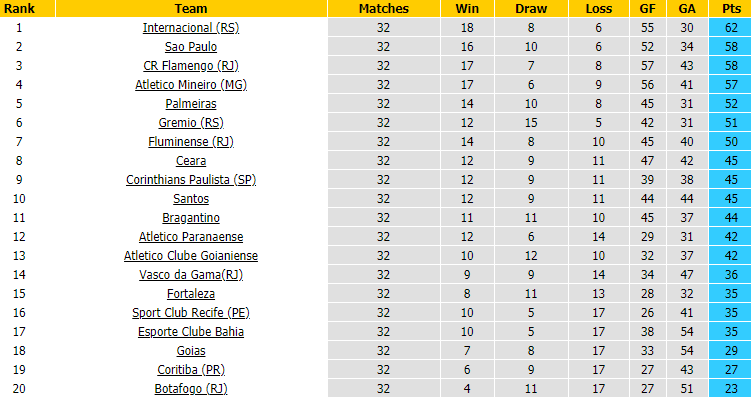 BẢNG XẾP HẠNG GIẢI VĐQG BRAZIL