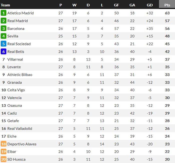 Bảng xếp hạng La Liga mới nhất