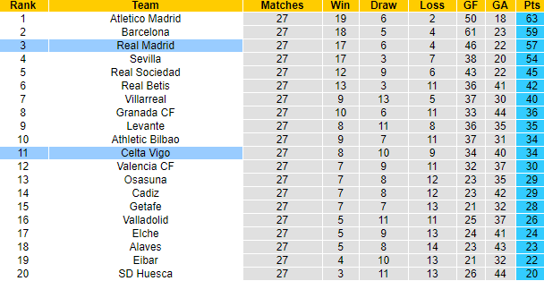 Chuyến làm khách sắp tới đến Celta Vigo, Real Madrid hạ quyết tâm cao hướng về chiến thắng. Bởi trên bảng xếp hạng La Liga lúc này họ đã đánh mất vị trí số 2 vào tay Barcelona. Kền kền trắng có 57 điểm sau 27 trận, kém Gã khổng lồ xứ Catalan 2 điểm.