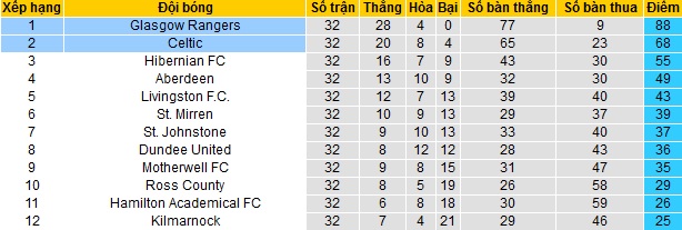 Bảng xếp hạng giải VĐQG Scotland trước vòng 33