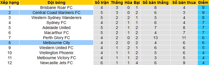Bảng xếp hạng giải VĐQG Úc vòng 5