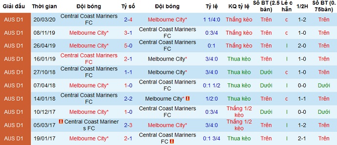 Tuy nhiên ở 3 lần gặp nhau gần nhất giữa hai đội Melbourne City đều giành chiến thắng với tỷ số cách biệt. Không những thế thành tích ngay trên sân nhà của Central Coast Mariners không thật tốt nên có lẽ chọn cửa dưới ở trận này có phần hợp lý hơn.