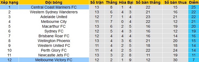 Trái lại, Melbourne Victory vẫn chưa thể thoát khỏi vị trí cuối cùng của bảng xếp hạng. Chỉ có được 7 điểm sau 12 vòng đấu, Melbourne Victory vẫn đang còn kém đội áp chót Newcastle Jets 4 điểm nhưng thi đấu ít hơn 1 trận.