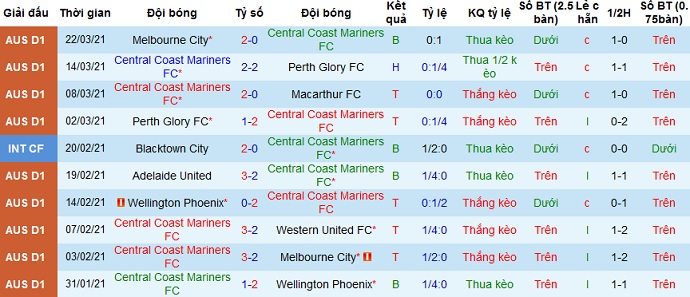 + Soi tỷ lệ kèo châu Á: Với vị thế hơn hẳn đối thủ trên bảng xếp hạng nên việc Central Coast Mariners được đánh giá là đội cửa trên cũng hoàn toàn hợp lý và dễ hiểu. Tuy nhiên do phong độ có phần sa sút của đội chủ nhà ở thời gian gần đây nên kèo chấp chỉ đang là -0,75.