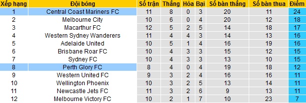 Trong khi đó Perth Glory hiện chỉ đang đứng thứ 8 trên bảng xếp hạng với 12 điểm sau 8 vòng đấu. Hiện tại đội bóng đang còn cách Top 6 tới 4 điểm đồng thời bị tới 3 đội phía sau bám đuổi rất sát khi khoảng cách chỉ còn là 1 điểm.