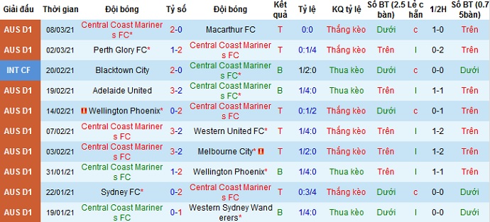 + Thống kê 10 trận gần nhất của Central Coast Mariners