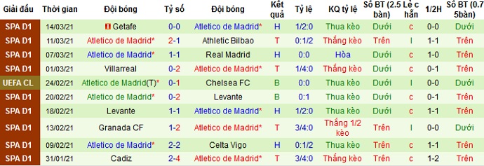 + Thống kê 10 trận gần nhất của Atletico Madrid
