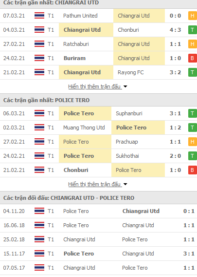 Phong độ và thống kê đối đầu gần đây Chiangrai vs Police Tero: