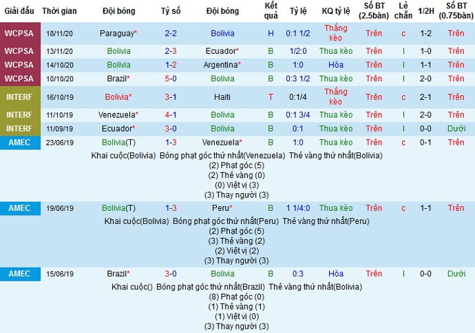 Ngoài 3 trận thua và 1 trận hòa trong năm 2020, trước đó Bolivia đã từng để thua tới 8 trận liên tiếp trên mọi mặt trận, trước khi có trận thắng trước Haiti với tỷ số 3-1. Trên sân khách Bolivia cũng để thua 7 trận liên tiếp trước khi có được trận hòa ở lần du đấu gần nhất với Paraguay.