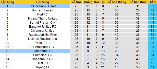 Chonburi hiện tại chỉ đang đứng thứ 12 tại giải vô địch quốc gia Thái Lan với 30 điểm sau 25 vòng đấu. Tuy đội bóng chỉ đứng trên nhóm các đội cầm đèn đỏ có 2 bậc nhưng đang có nhiều hơn 7 điểm. Dù sao đây cũng là khoảng cách tương đối an toàn khi giải chỉ còn 5 vòng nữa là kết thúc.