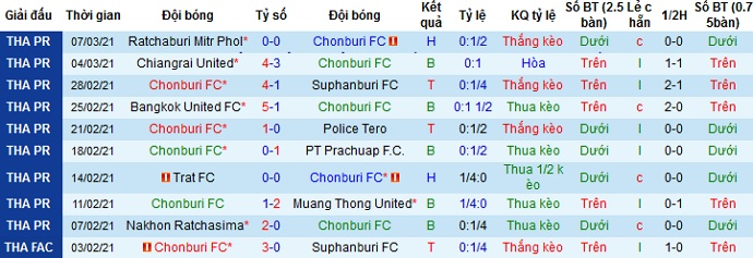 Trong 5 trận đấu gần đây Chonburi cũng có được 2 trận thắng, 1 trận hòa và 2 trận thua. Đáng nói là cả 2 trận thắng đội bóng đều có được trên sân nhà ở các trận gần nhất tại đây trong khi trước đó đã để thua liên tiếp 4 vòng đấu trên sân nhà.