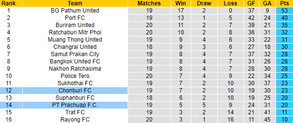 Sau 19 trận, Chonburi mới giành được 23 điểm, đứng tận thứ 12 và chỉ hơn vị trí cầm đèn đỏ có 3 điểm, cách biệt rất mong manh. Cuộc chiến trụ hạng đã bắt đầu với họ và nếu sảy chân 1, 2 vòng thì Chonburi hoàn toàn có thể rơi xuống vùng nguy hiểm.