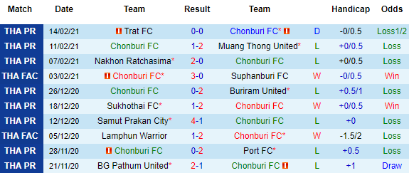 + Thống kê 10 trận gần nhất của Chonburi