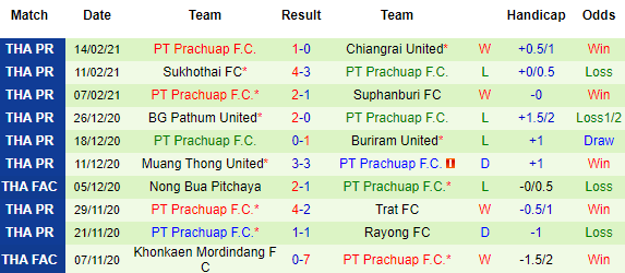 + Thống kê 10 trận gần nhất của Prachuap