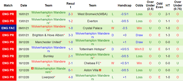 - Thống kê 10 trận gần nhất của Wolves
