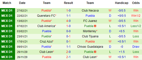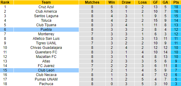 Bên phía đối diện, Puebla lại có phong độ không tồi khi giành được 12 điểm/8 trận và đang có mặt ở vị trí thứ 6. Về cơ bản, Puebla vẫn sáng cửa cạnh tranh một vị trí trong top 4 để có mặt ở giai đoạn Final mà không phải trải qua lượt trận play-off đầy may rủi.