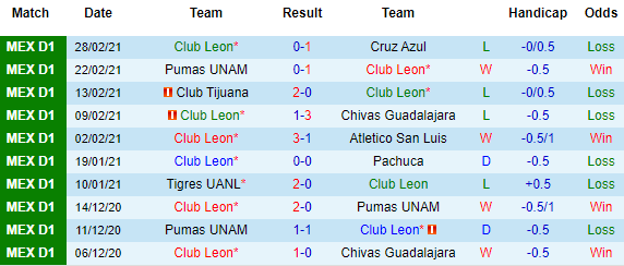 + Thống kê 10 trận gần nhất của Club Leon