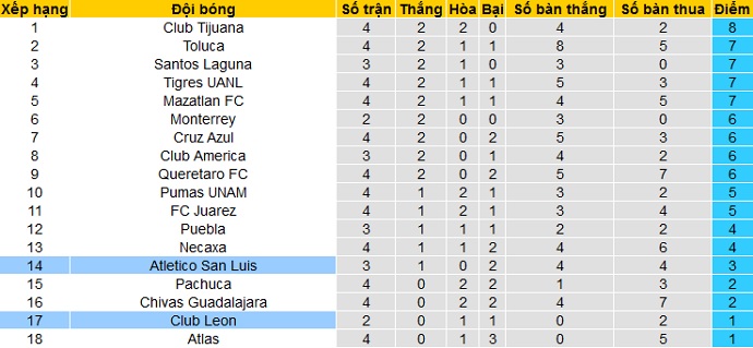 Trong khi đó Atlético San Luis ở giai đoạn lượt đi chỉ đứng bét bảng xếp hạng của giải đấu. Thế nhưng hiện tại đội bóng đang đứng thứ 14 của giai đoạn lượt về khi có được 3 điểm sau 3 vòng đầu tiên.