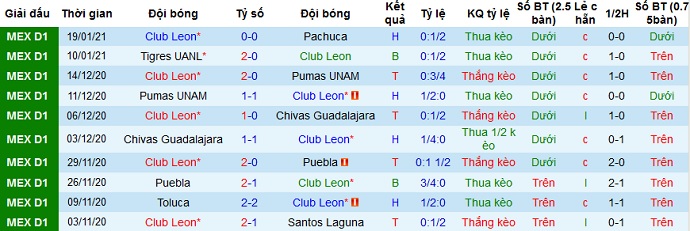 + Thống kê 10 trận gần nhất của Club León