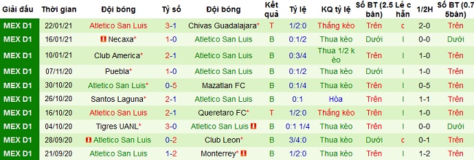 + Thống kê 10 trận gần nhất của San Luis