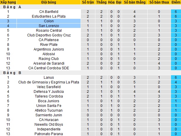 Bảng xếp hạng giải VĐQG Argentina vòng 2