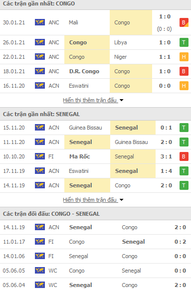 Phong độ và thống kê đối đầu gần đây Congo vs Senegal: