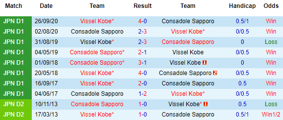 + Lịch sử đối đầu Consadole Sapporo vs Vissel Kobe