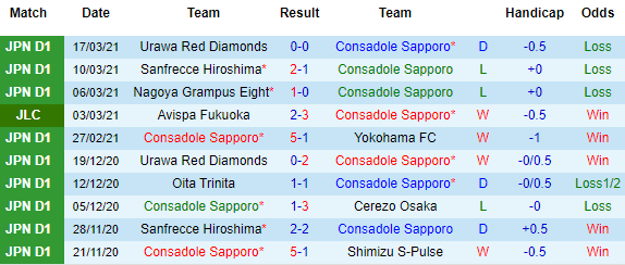 + Thống kê 10 trận gần nhất của Consadole Sapporo