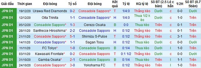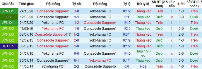 Trong lịch sử ở 5 lần đối đầu gần nhất khi Consadole Sapporo được thi đấu trên sân nhà, họ cũng đang giành ưu thế gần như tuyệt đối khi thắng 4 và hòa 1. Cùng với phong độ du đấu kém cỏi của Yokohama FC ở cuối mùa giải trước nên có lẽ chọn cửa trên ở trận đấu này vẫn là sự lựa chọn hợp lý.