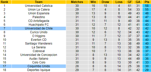 Thậm chí Coquimbo Unido hoàn toàn có thể rớt hạng trực tiếp bởi đối thủ cuối cùng chỉ kém họ có 1 điểm. Trong khi ấy, Univ de Chile là cái tên có số má của giải đấu, và vào thời điểm này họ cũng đang đứng thứ 7 trên BXH, vị trí được dự Copa Sudamericana.