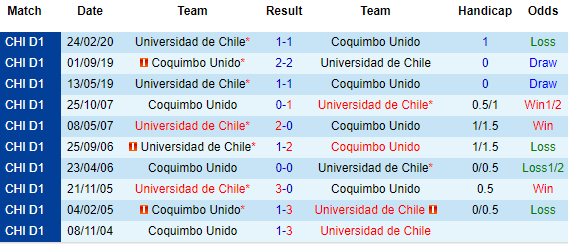 + Lịch sử đối đầu Coquimbo Unido vs Univ de Chile