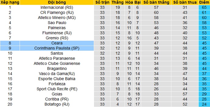 Bảng xếp hạng giải VĐQG Brazil trước vòng 34