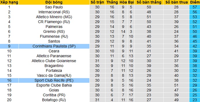 Trong khi đó Sport Recife chỉ đang đứng thứ 14 trên bảng xếp hạng với 32 điểm sau 30 vòng đấu. Mặc dù đang đứng trên nhóm các đội cầm đèn đỏ 3 bậc nhưng số điểm của Sport Recife cũng chỉ bằng điểm với đội đứng thứ 17 nên nguy cơ bị tụt hạng đang hiển hiện trước mắt.