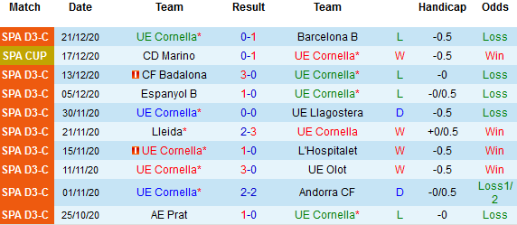 + Thống kê 10 trận gần nhất của Cornella