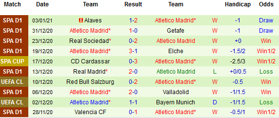 + Thống kê 10 trận gần nhất của Atletico Madrid